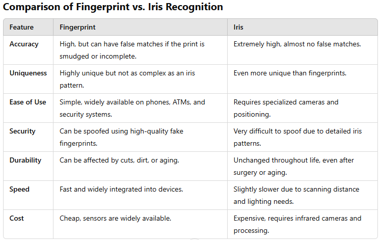 For high-security applications (government, border control, military) → Iris is better due to higher accuracy and resistance to spoofing.
